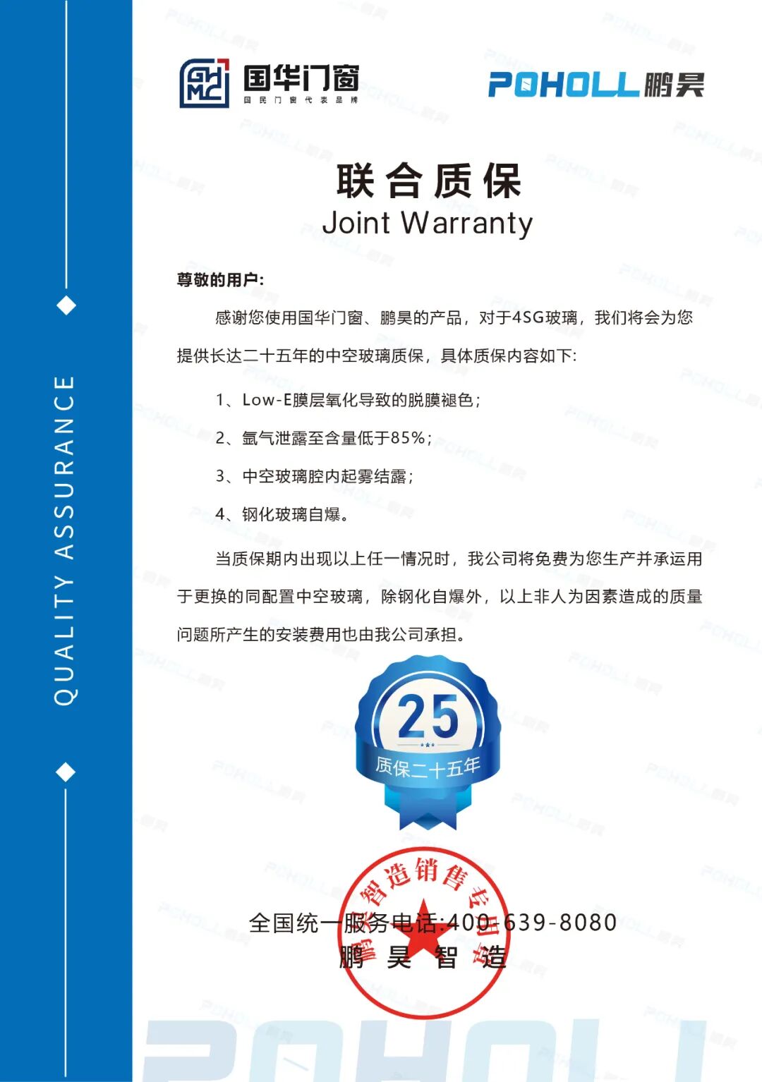विशेष म्हणजे, गुओहुआ डोअर्स आणि विंडोज आणि पेंघाओ यांनी संयुक्तपणे विस्तारित वॉरंटी लाँच केली आहे, जी 4SG ग्लास इन्सुलेट ग्लासवर 25 वर्षांची वॉरंटी प्रदान करते. या वचनबद्धतेमध्ये लो-ई फिल्मच्या ऑक्सिडेशनमुळे होणारे डिलेमिनेशन आणि विकृतीकरण, 85% च्या खाली आर्गॉन गॅसची गळती, इन्सुलेटिंग काचेच्या पोकळीमध्ये फॉगिंग आणि कंडेन्सेशन आणि टेम्पर्ड ग्लास उत्स्फूर्त स्फोट यासह अनेक प्रमुख समस्यांचा समावेश आहे. अशी सर्वसमावेशक आणि दीर्घकालीन वॉरंटी उद्योगात दुर्मिळ आहे आणि उत्पादनाच्या गुणवत्तेवर दोन्ही पक्षांचा विश्वास आणि ग्राहकांप्रती त्यांची सखोल वचनबद्धता पूर्णपणे प्रदर्शित करते.